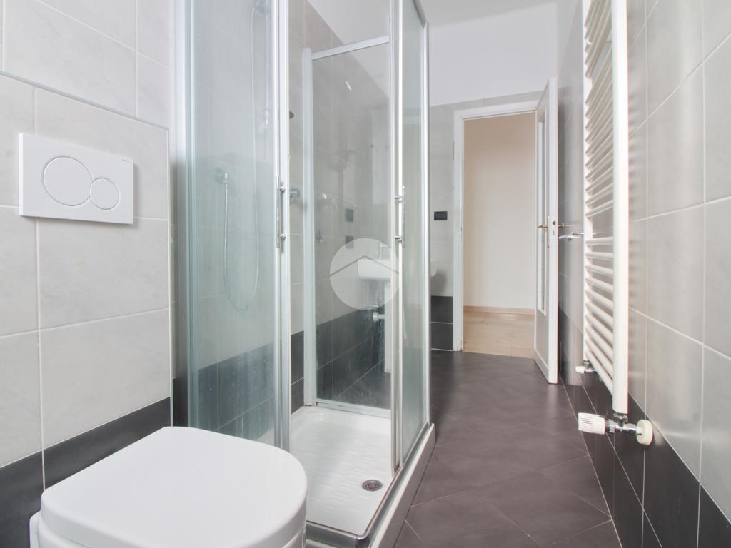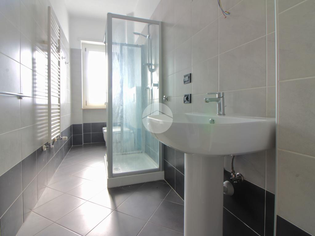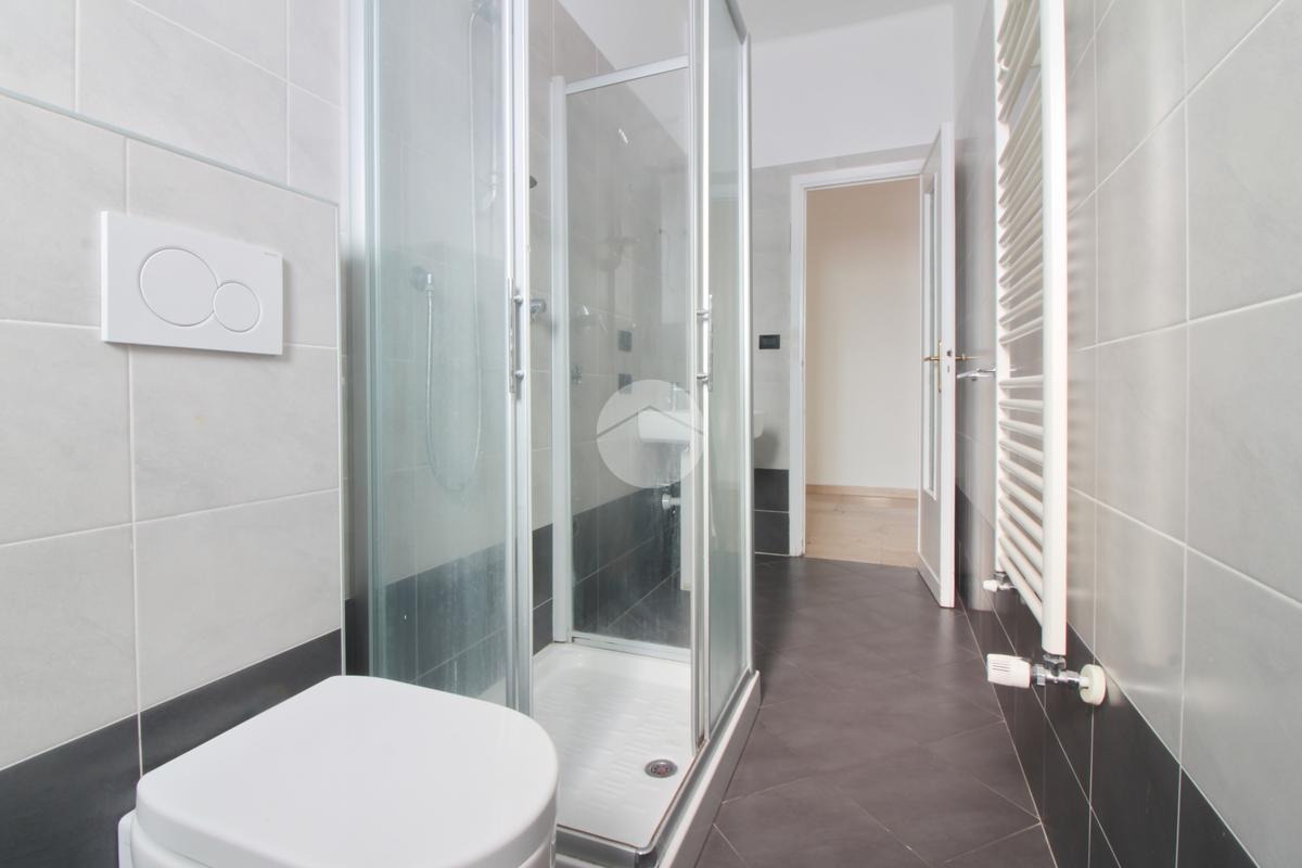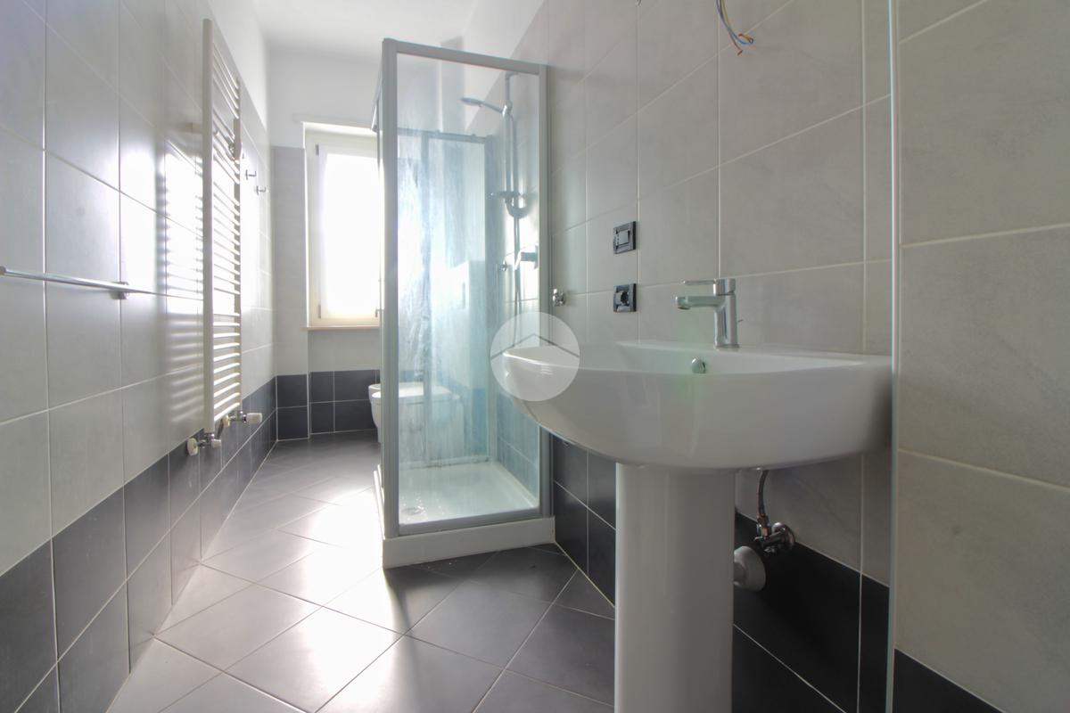Il bagno è distribuito in lunghezza ed è fornito di doccia, sanitari e attacchi per la lavatrice.