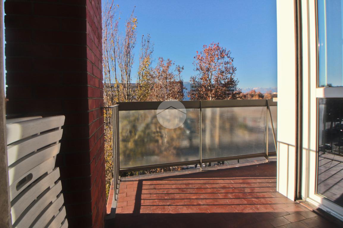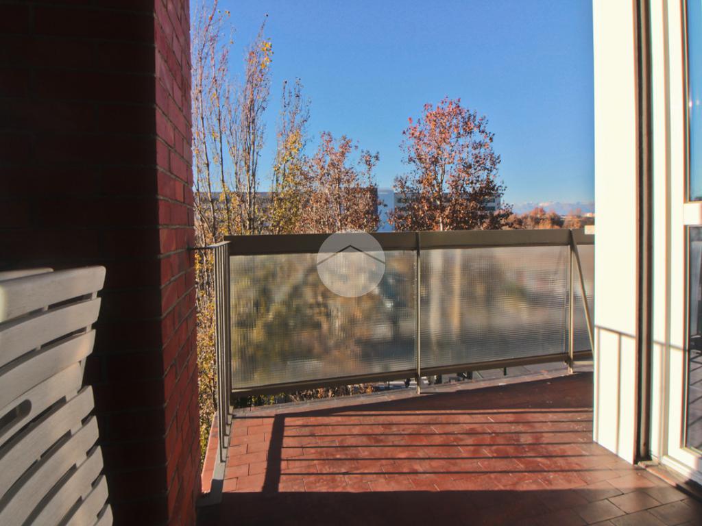 L'appartamento gode di doppia esposizione con due balconi. Il balcone esterno affaccia ad Ovest, con accesso dalla zona giorno e dalla camera da letto. Il balcone interno affaccia sull'interno cortile, ad Est ed è accessibile dalla cabina armadio.
